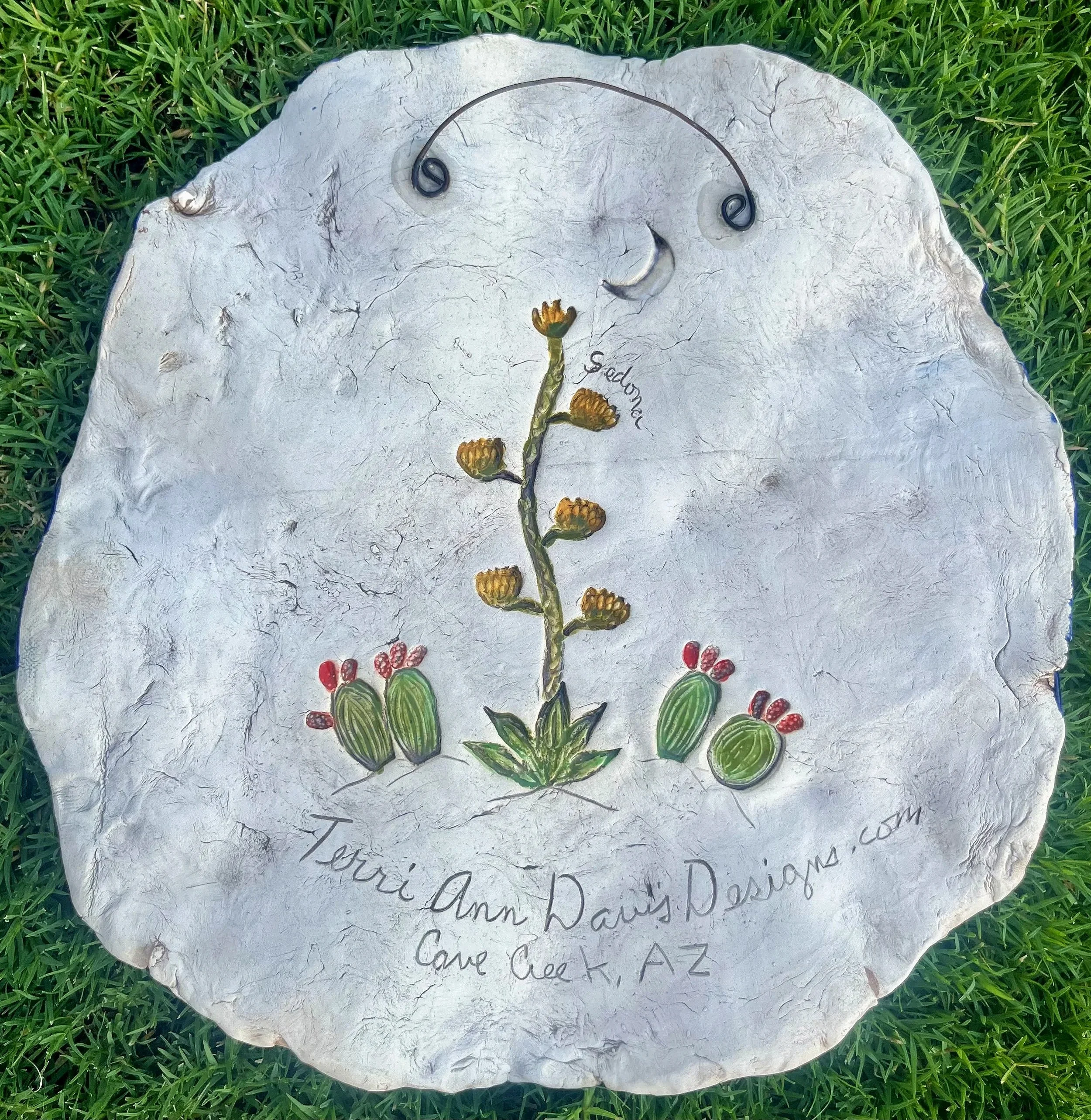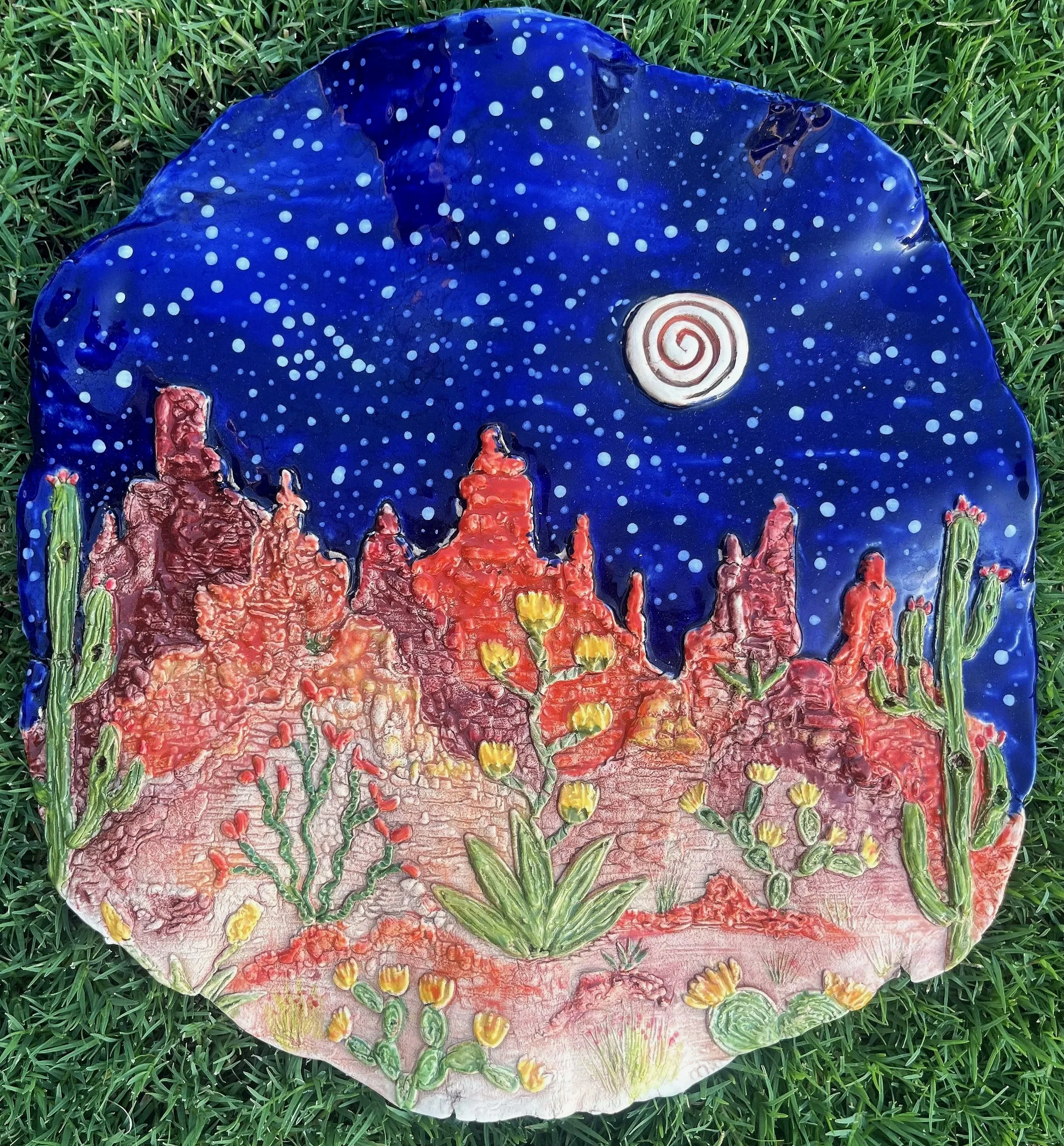This plaque captures the quiet magic of Sedona’s night skyline—featuring hand-painted rock formations, blooming desert flora, and a star-filled sky crowned with a spiral moon.